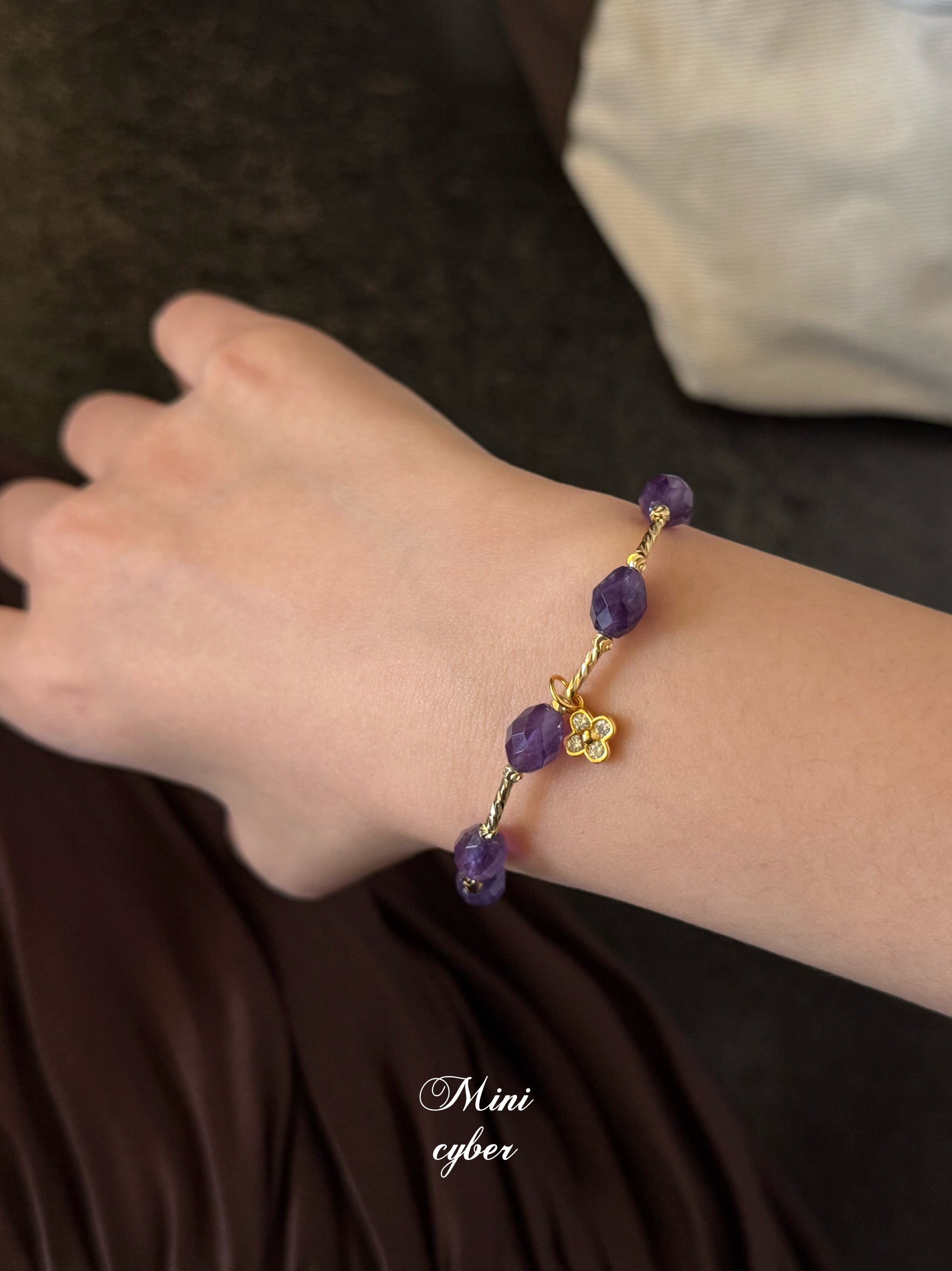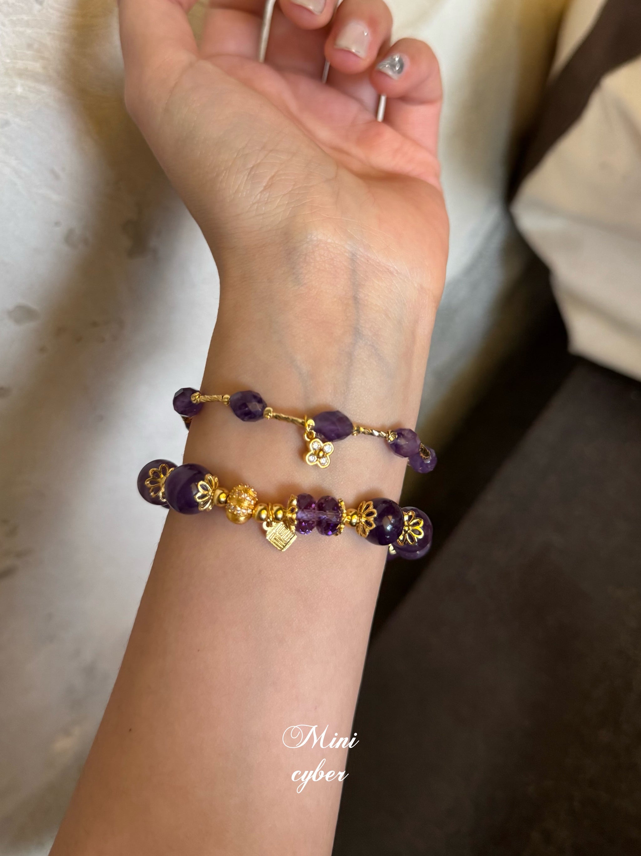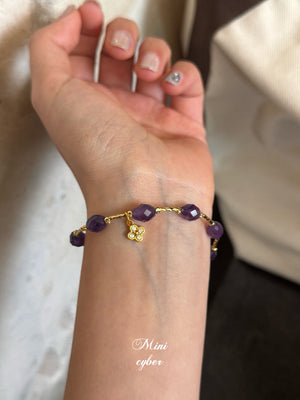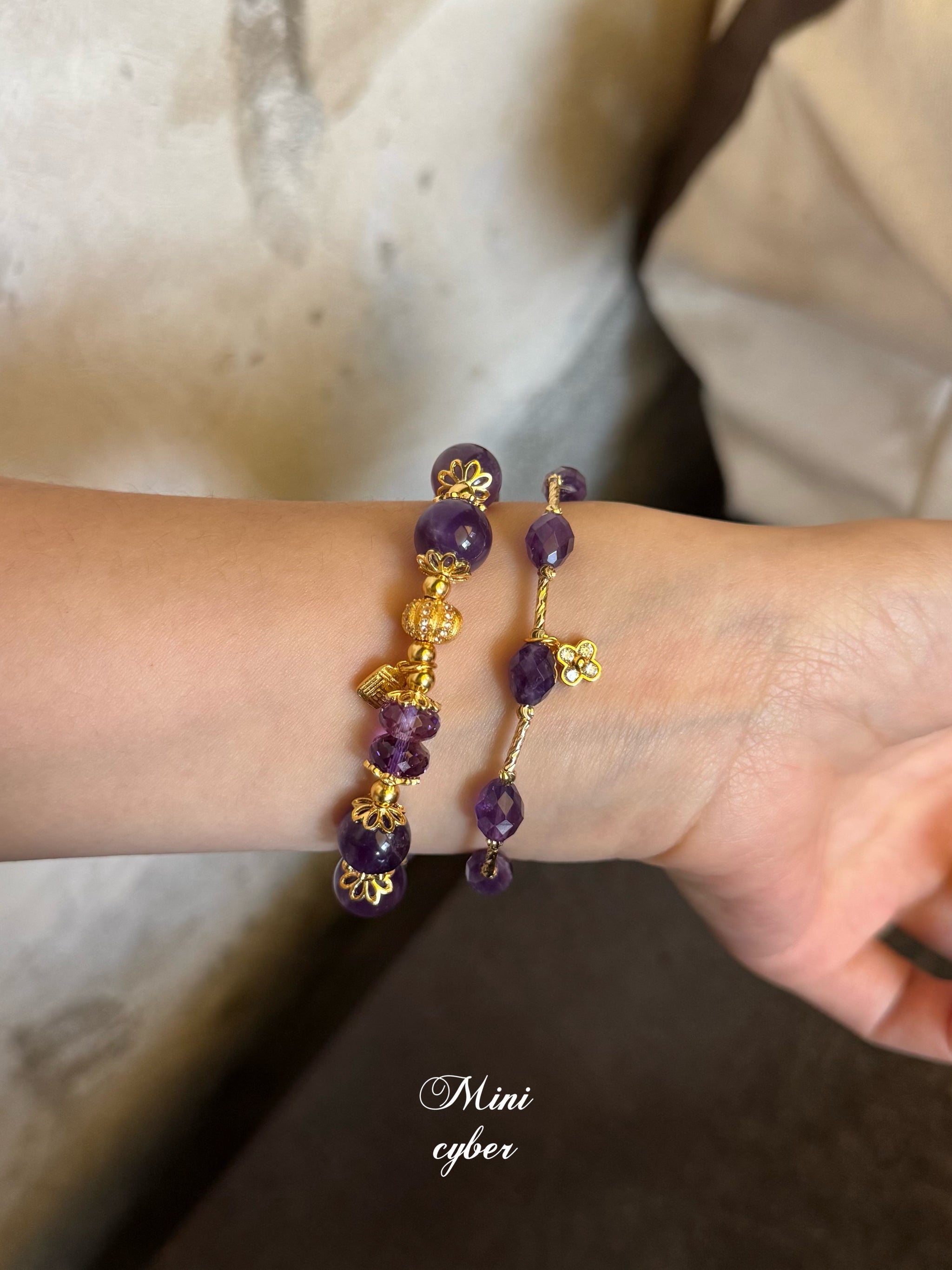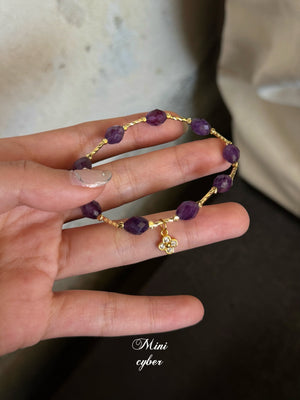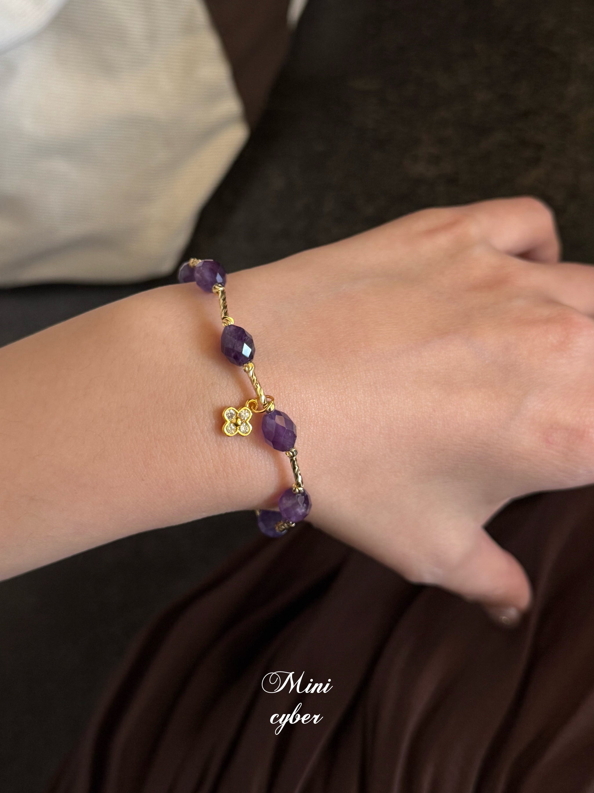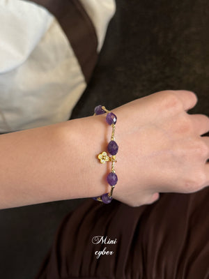 Drape yourself in enchantment with the Floral Amethyst Infused with Fig Aroma Bracelet. Each natural amethyst, shimmering with a delicate purple glow, is interwoven with copper accents for a vintage touch. The sophisticated fig-inspired design adds a subtle, romantic aura to every movement. With a gentle jingle, this bracelet is a captivating and stylish expression of grace and fantasy.
