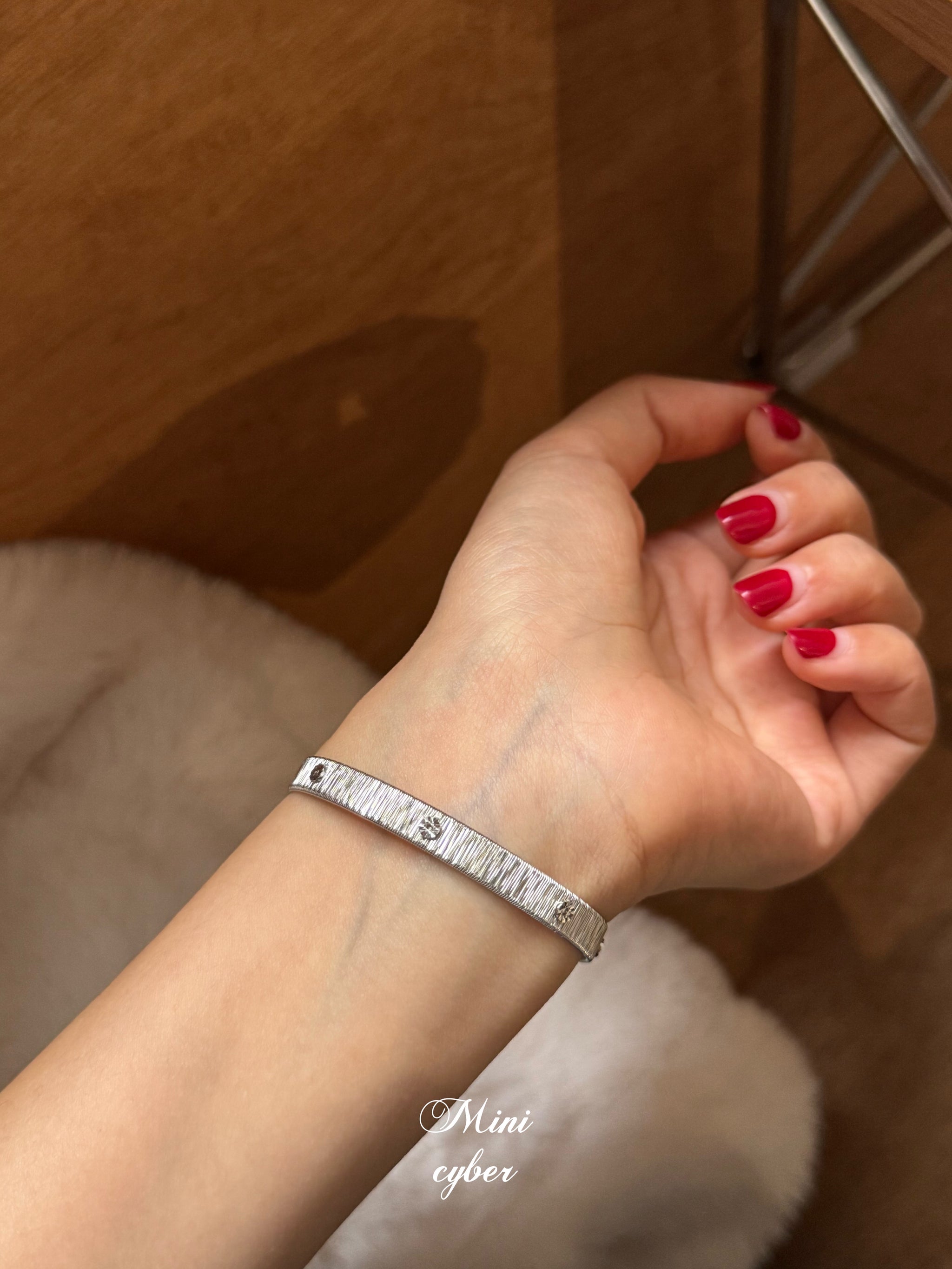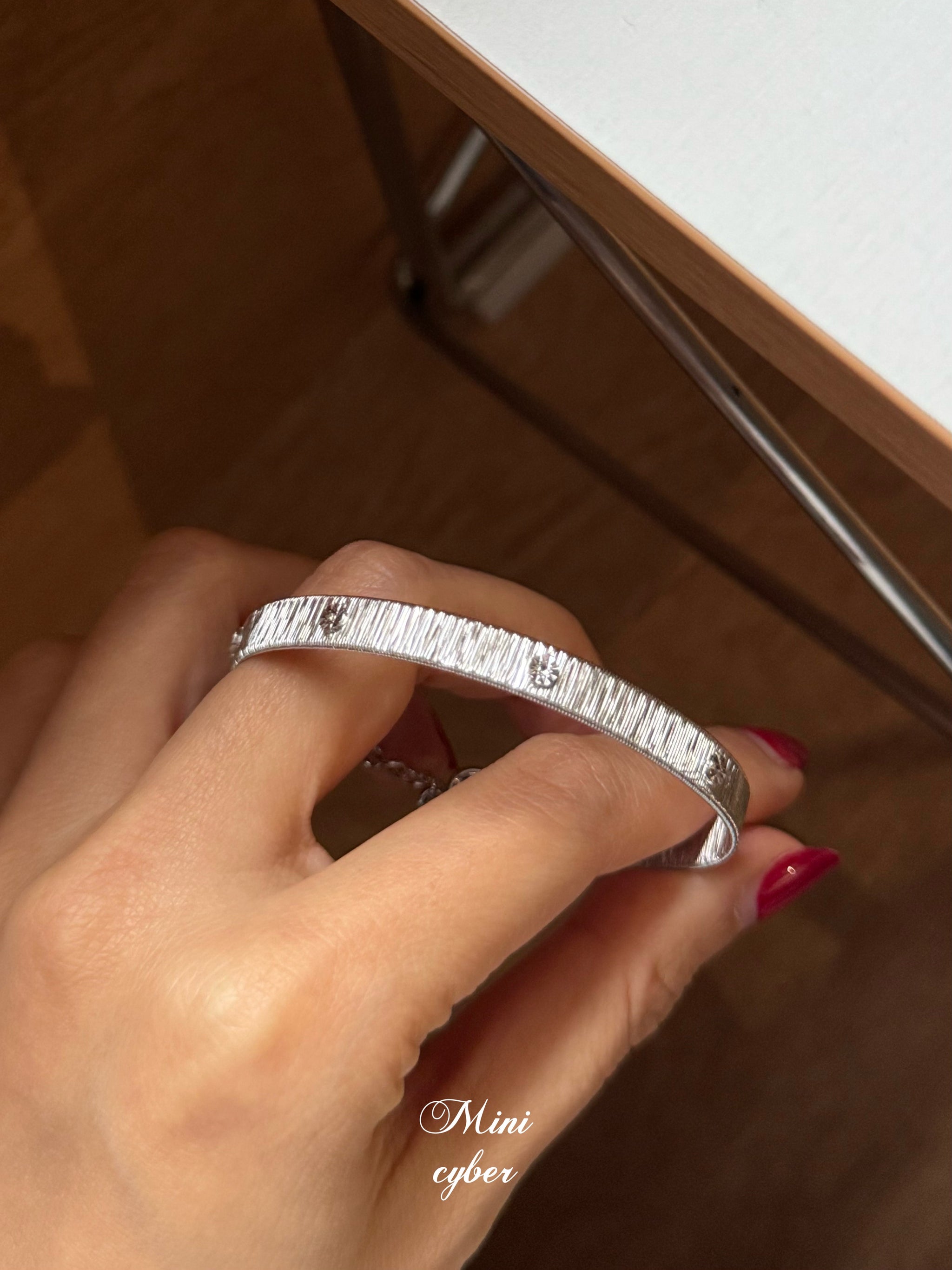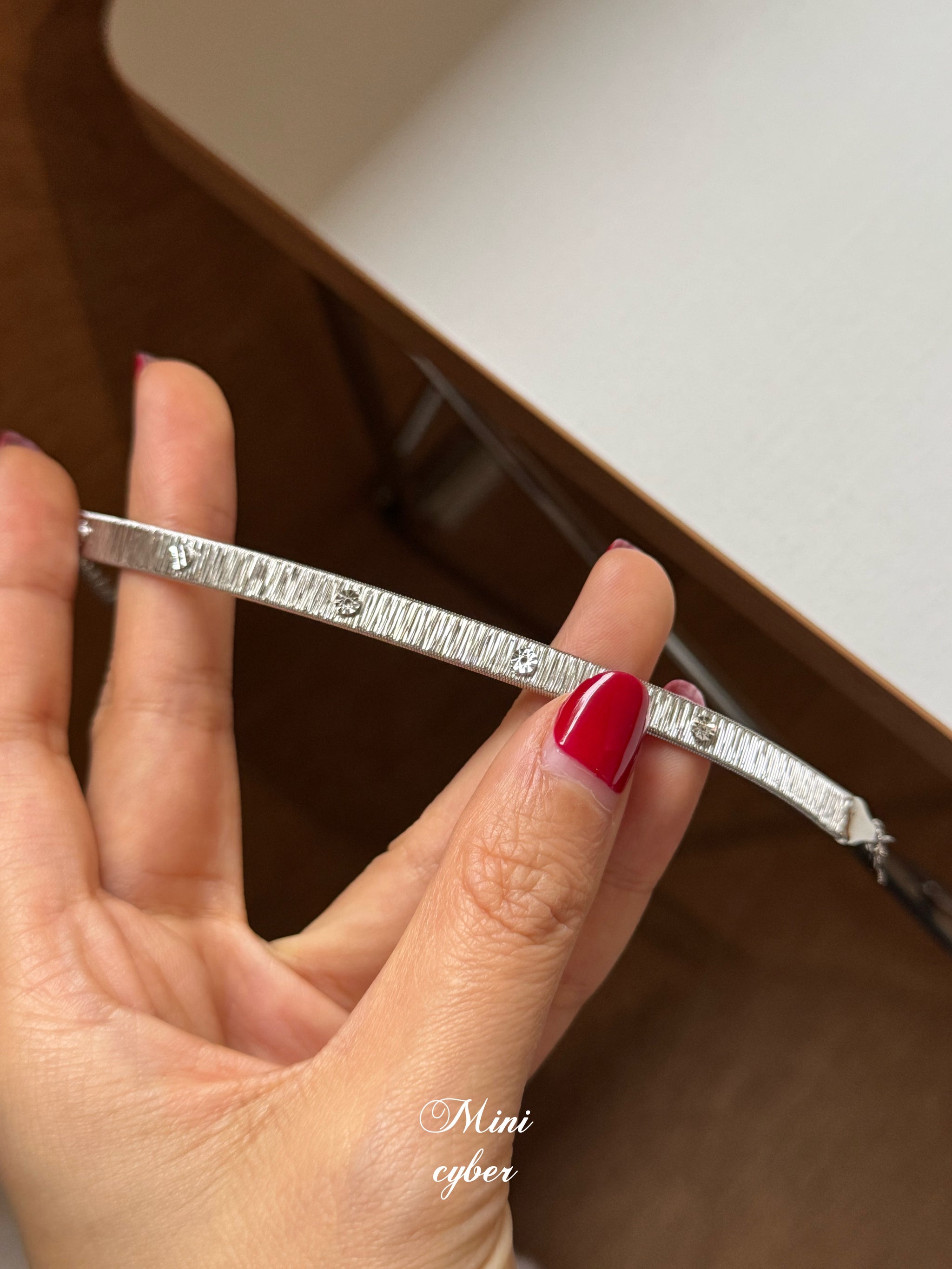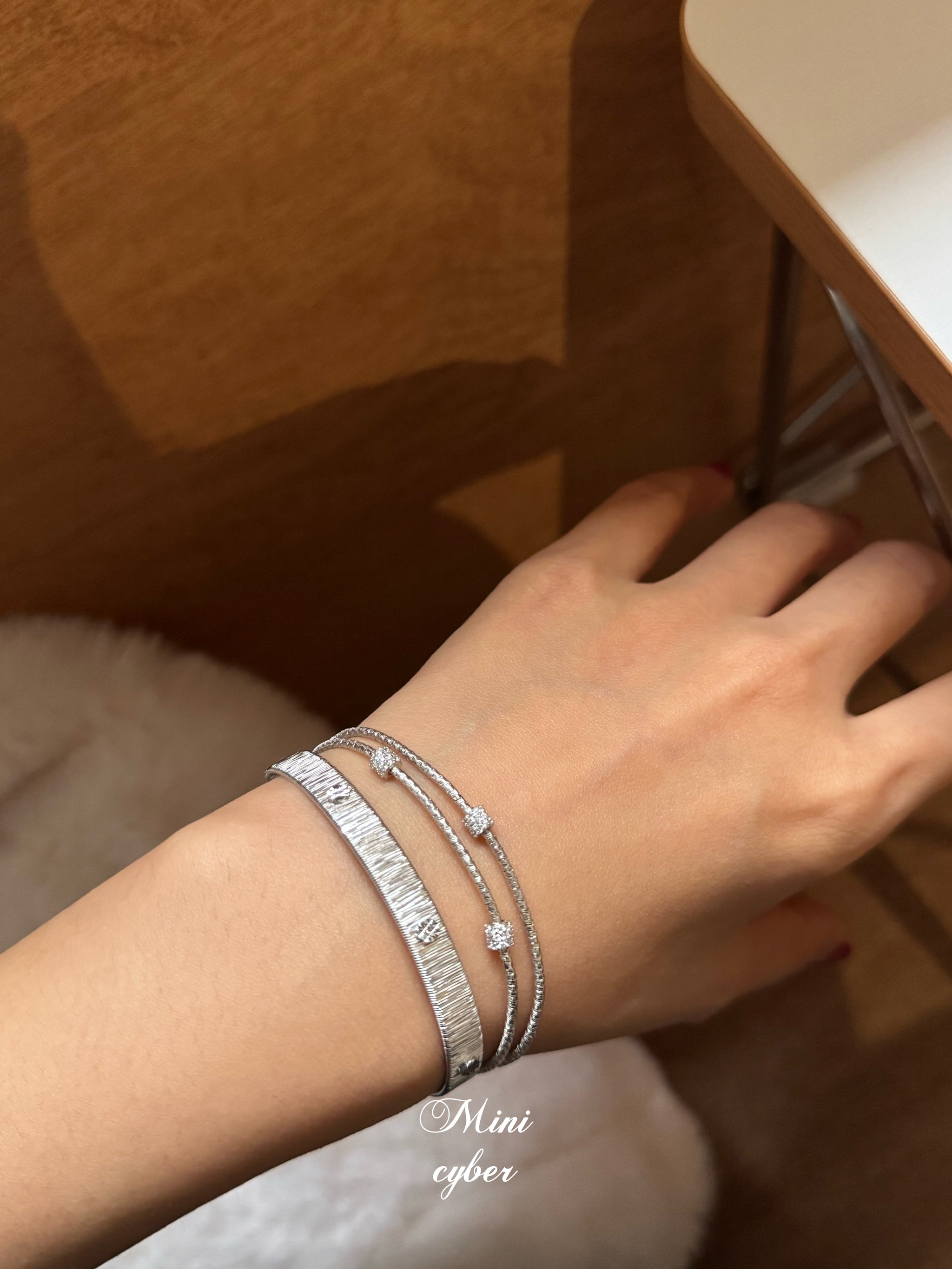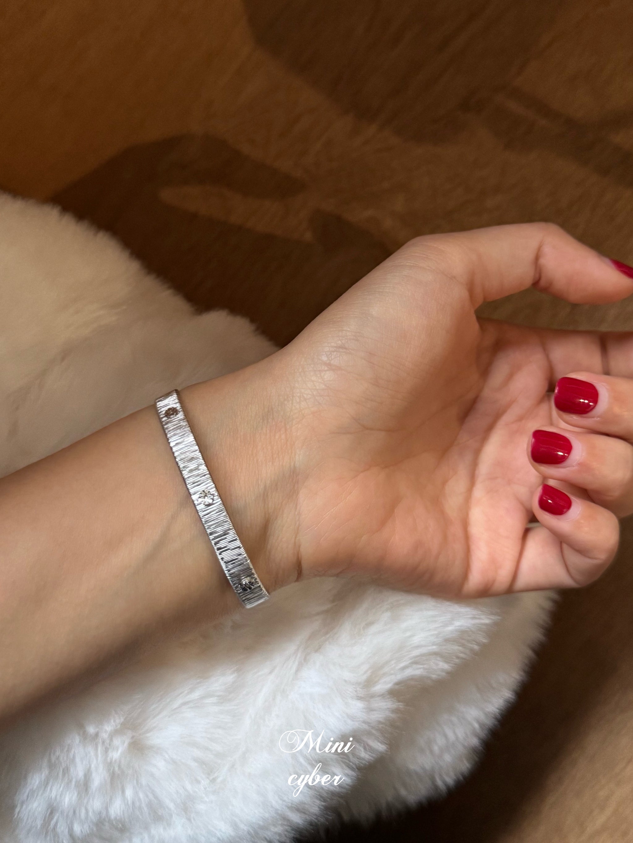 This Satin-Soft Boucheron-Inspired Bracelet exemplifies the pinnacle of artisanal metalwork, where precision engineering meets artistic vision. The craftsmen have masterfully carved the metal surface into delicate textures that evoke silk, lace, and velvet—transforming rigid material into something remarkably fluid and organic. The widened cuff design commands presence on the wrist while maintaining an elegant, refined silhouette. Scattered round zircons catch light like captured starlight, creating an understated luminosity that whispers rather than shouts. This piece embodies the "old money" aesthetic: timeless, sophisticated, and effortlessly luxurious. A statement of quiet confidence for those who understand that true elegance requires no explanation.
